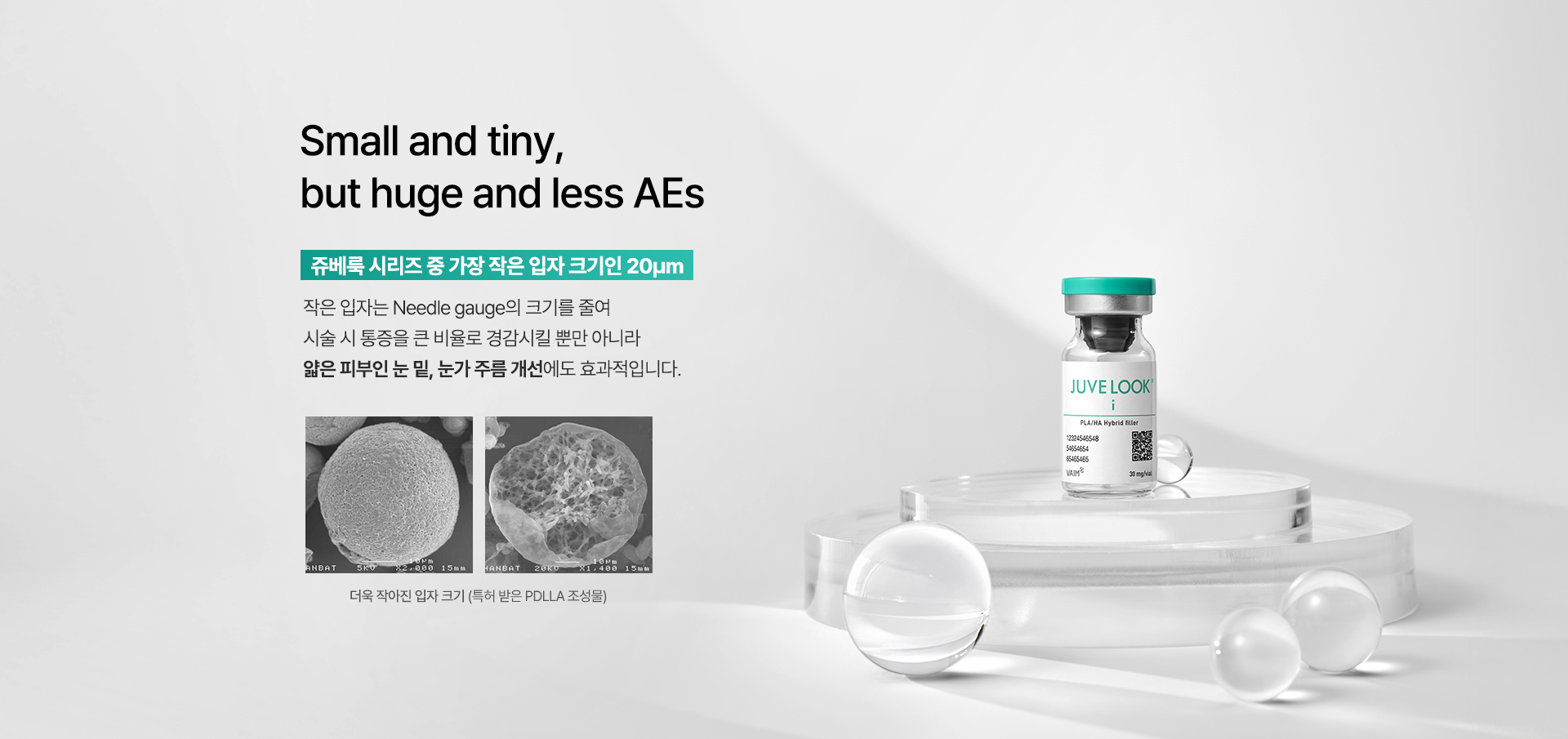 작은 입자는 Needle gauge의 크기를 줄여 시술 시 통증을 큰 비율로 경감시킬 뿐만 아니라 얇은 피부인 눈 밑, 눈가 주름 개선에도 효과적입니다.