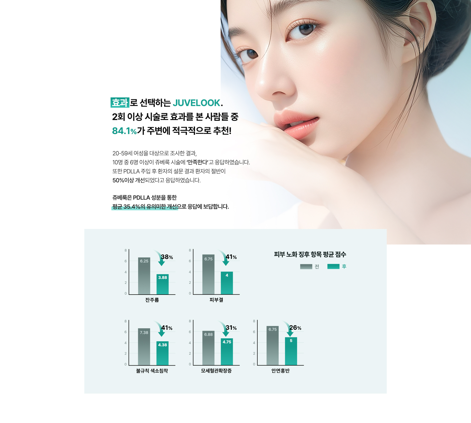 20-59세 여성을 대상으로 조사한 결과, 10명 중 6명 이상이 쥬베룩 시술에 '만족한다'고 응답하였습니다. 또한 PDLLA 주입 후 환자의 설문 결과 환자의 절반이 50%이상 개선되었다고 응답하였습니다.